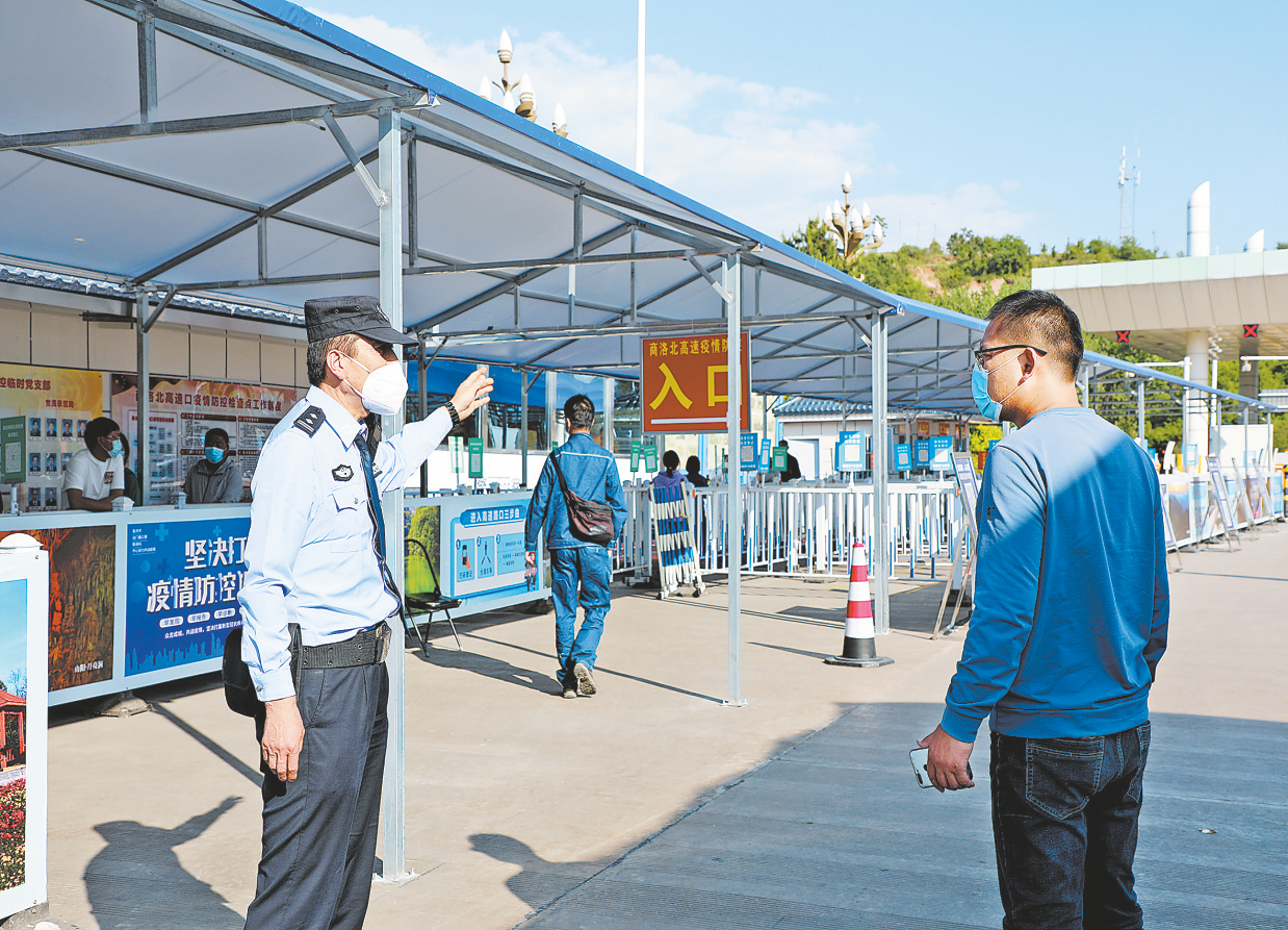 商洛北疫情防控檢查站實行每天三班輪流值守制度,早班從8點到下午4點,中班從下午4點到11點,晚班從11點到第二天早上8點。每班次由一名縣級領導帶班,安排了城管干部10人、公安民警6人、交警4人、醫(yī)務人員4人共同承擔疫情防控工作任務。巡特警大隊民警主要負責外圍治安,協助勸返中高風險地區(qū)車輛,維護站內外正常秩序。