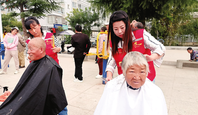 近日,志愿者在景村街社區(qū)廣場開展孝德實(shí)踐活動,為轄區(qū)老人義務(wù)理發(fā)。