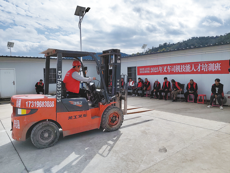 為全面打贏穩(wěn)就業(yè)促增收硬仗,洛南縣以“技能照亮前程”為主題,聚焦農(nóng)村勞動力、脫貧群眾等重點群體就業(yè)需求,積極開展職業(yè)技能提升培訓,助力更多群眾掌握一技之長,實現(xiàn)就業(yè)創(chuàng)業(yè)。圖為10月15日,洛南縣人社局聯(lián)合洛南富康職業(yè)技能培訓學校,在石門鎮(zhèn)易地搬遷社區(qū)為30多名群眾開展叉車司機培訓。(本報通訊員 王建榮 攝)