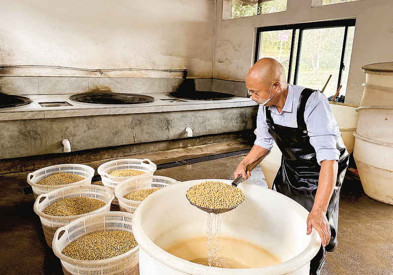 務(wù)工人員將泡好的黃豆撈出,準(zhǔn)備打漿。